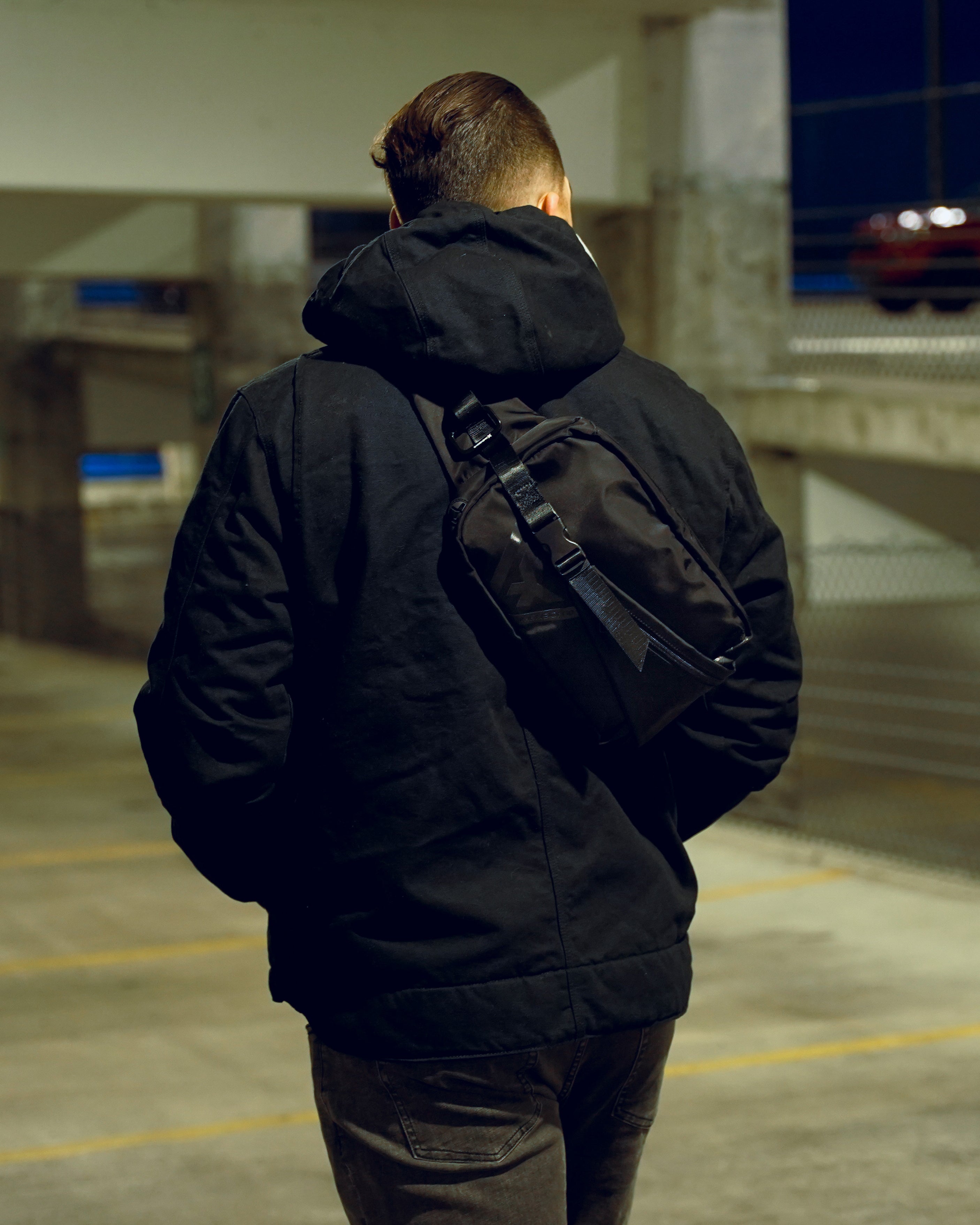 Hidden zipper pull and mechanical clip protect access points in crowds and transit.